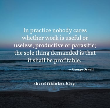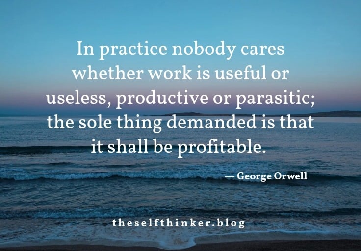 " In practice, nobody cares whether work is useful or useless, productive or parasitic; the sole thing demanded is that it shall be profitable."